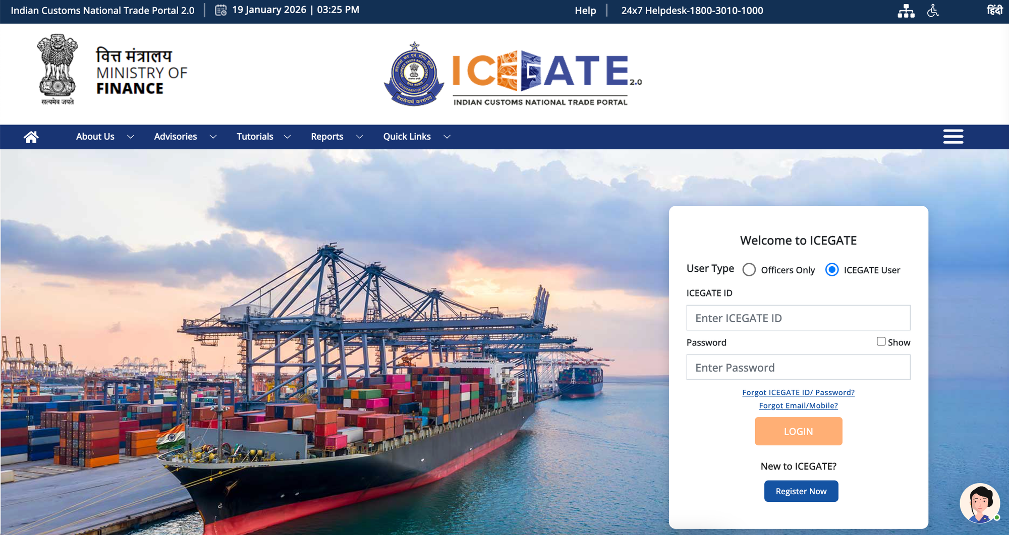 ICEGATE (Indian Customs Electronic Data Interchange Gateway) is the official online portal of Indian Customs where importers, exporters, and customs brokers file all customs documents electronically. ICEGATE enables electronic filing of Bills of Entry (imports), Shipping Bills (exports), IGM (Integrated Manifest), and online payment of customs duties. ICEGATE is the digital gateway for all international trade through India, managed by the Central Board of Indirect Taxes and Customs (CBIC). Understanding ICEGATE login process, how to file documents, download shipping bills, and register AD codes is critical for any importer or exporter operating in India.